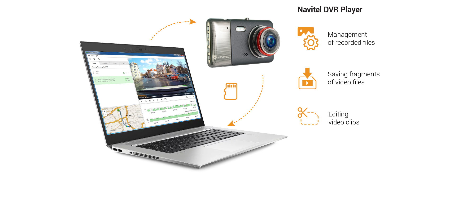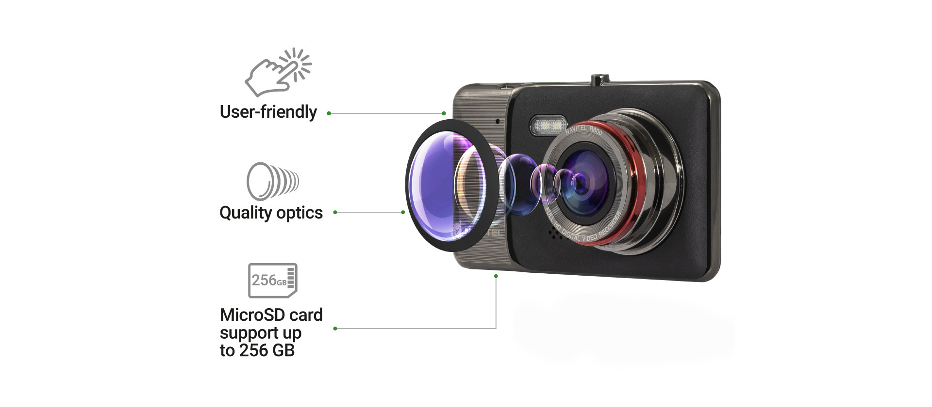NAVITEL R800 switches on automatically after the engine has started. It features a built-in G-sensor that marks and protects critical footage surrounding an accident in case of sudden acceleration, braking or collision. Night mode and parking mode are supported.
