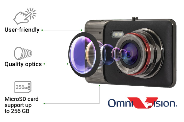 The device has a panoramic viewing angle of 170°. Thanks to the highly efficient compression format H.264, files take less space on a microSD card. Footage and images are stored on a microSD card with the capacity of up to 256 GB.