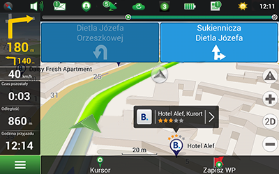 Serwis Booking.com jest zintegrowaną częścią Navitel Navigator, co pozwala zarezerwować miejsce noclegowe bez wychodzenia z aplikacji. Z włączoną funkcją, zobaczysz hotele dostępne przez serwis Booking.com na mapie oraz w opcji Najbliższe miejsce w zakładce Znajdź , poprzez wybranie katergori Hotele/Zakwaterowanie.