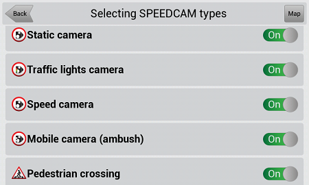 Sie können jetzt die Typen der Geschwindigkeitsmesskameras auswählen, die Sie auf der Karte anzeigen möchten und über die Sie informiert werden möchten.