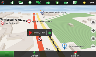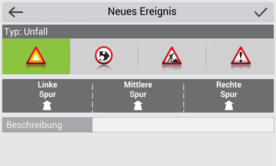 Die Daten des Dienstes Navitel.Ereignisse werden gemeinsam mit den Informationen des Dienstes Navitel.Verkehr aktualisiert. Die Information über Ereignisse erlischt automatisch nach 3 Stunden oder 30 Minuten nach der letzten Bestätigung.