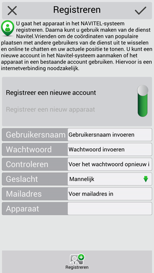 Om de "Navitel.Vrienden" -service te gebruiken, moet u zich registreren op https://navitel.cz/nl en ten minste één apparaat met geactiveerde Navitel Navigator-licentie hebben. Dit apparaat moet worden toegevoegd aan de sectie "Mijn apparaten" in uw privégedeelte op de website.