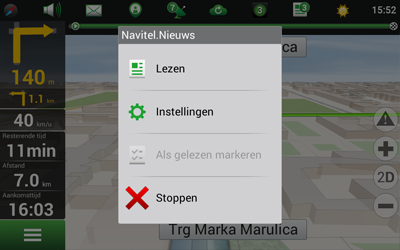 U kunt ook het Navitel.Nieuws-pictogram op de werkbalk plaatsen. Ga daarvoor naar Menu > Instellingen > Interface > Kaartknoppen en schakel vervolgens het pictogram Navitel.Nieuws in.